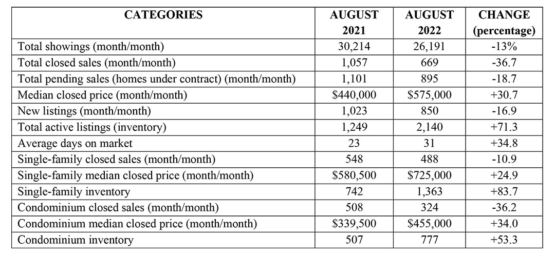 While overall closed sales for August decreased 36.7 percent to 669 from 1,057 in August 2021, it increased 5.6 percent compared to July’s closed sales. Historically, closed sales and pending sales (homes under contract) in August do not outperform July’s closed and pending sales. But this year is different. “Pending sales in August